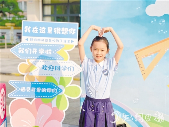 新會華僑實驗第二小學全新升級的校門成為學生合影的“打卡”點。