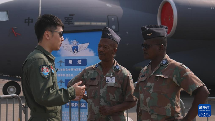 9月18日,中國(guó)空軍運(yùn)-20機(jī)組成員在南非首都比勒陀利亞的非洲航空航天與防務(wù)展上向外國(guó)友人進(jìn)行介紹。新華社發(fā)(王銳杰攝)