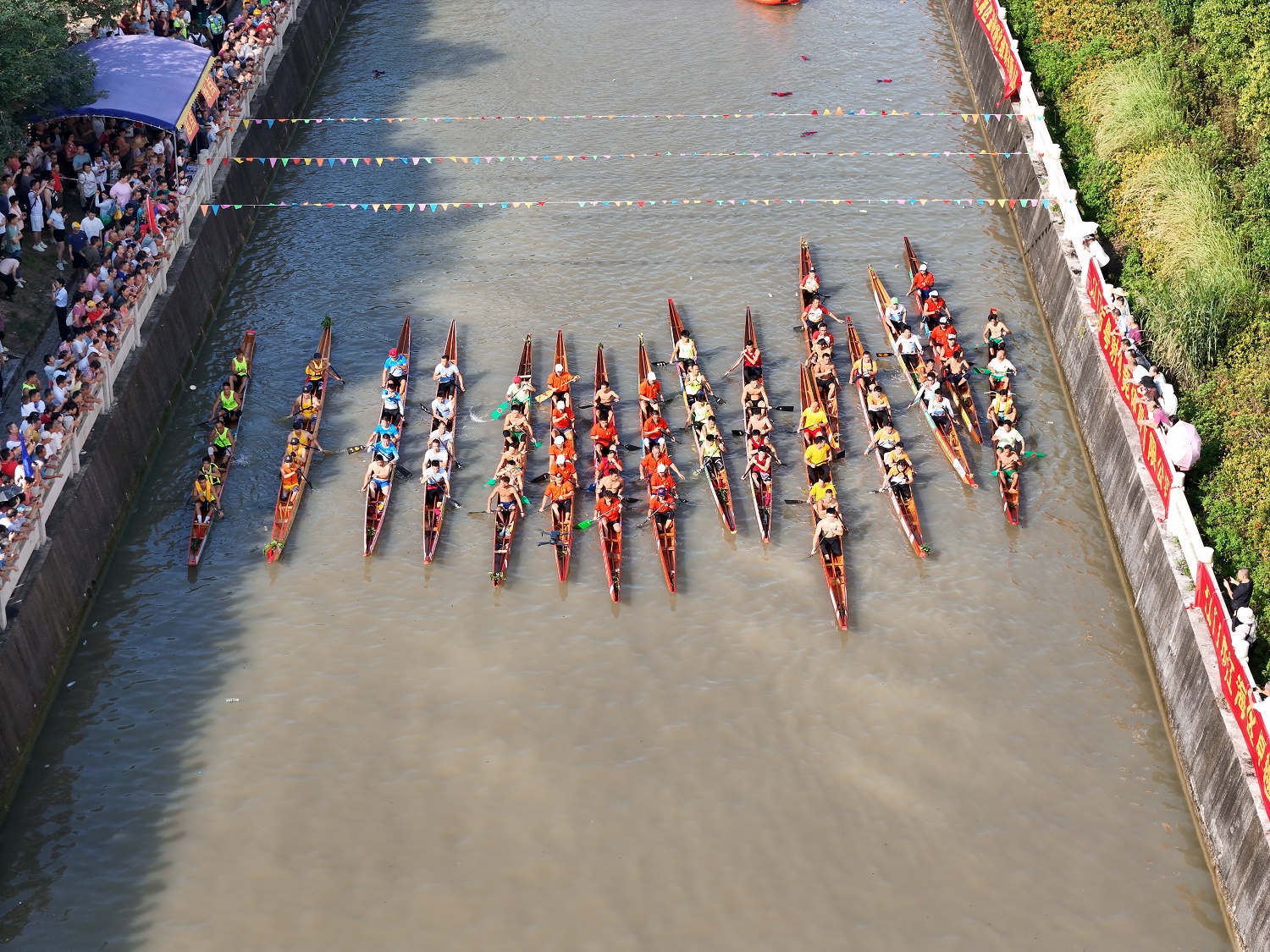 ????上午8時(shí)30分,隨著一聲清脆的哨響,16支艇隊(duì)如離弦之箭沖了出去,瞬間劃破了河面的平靜。每艘五人艇上,“扒仔”們緊握船橈,肌肉緊繃,眼神堅(jiān)定,每一次揮槳都凝聚著全身的力量與決心,槳葉在水中翻飛,濺起一片片水花,展現(xiàn)出外海人民團(tuán)結(jié)奮進(jìn)、勇往直前的精神風(fēng)貌。