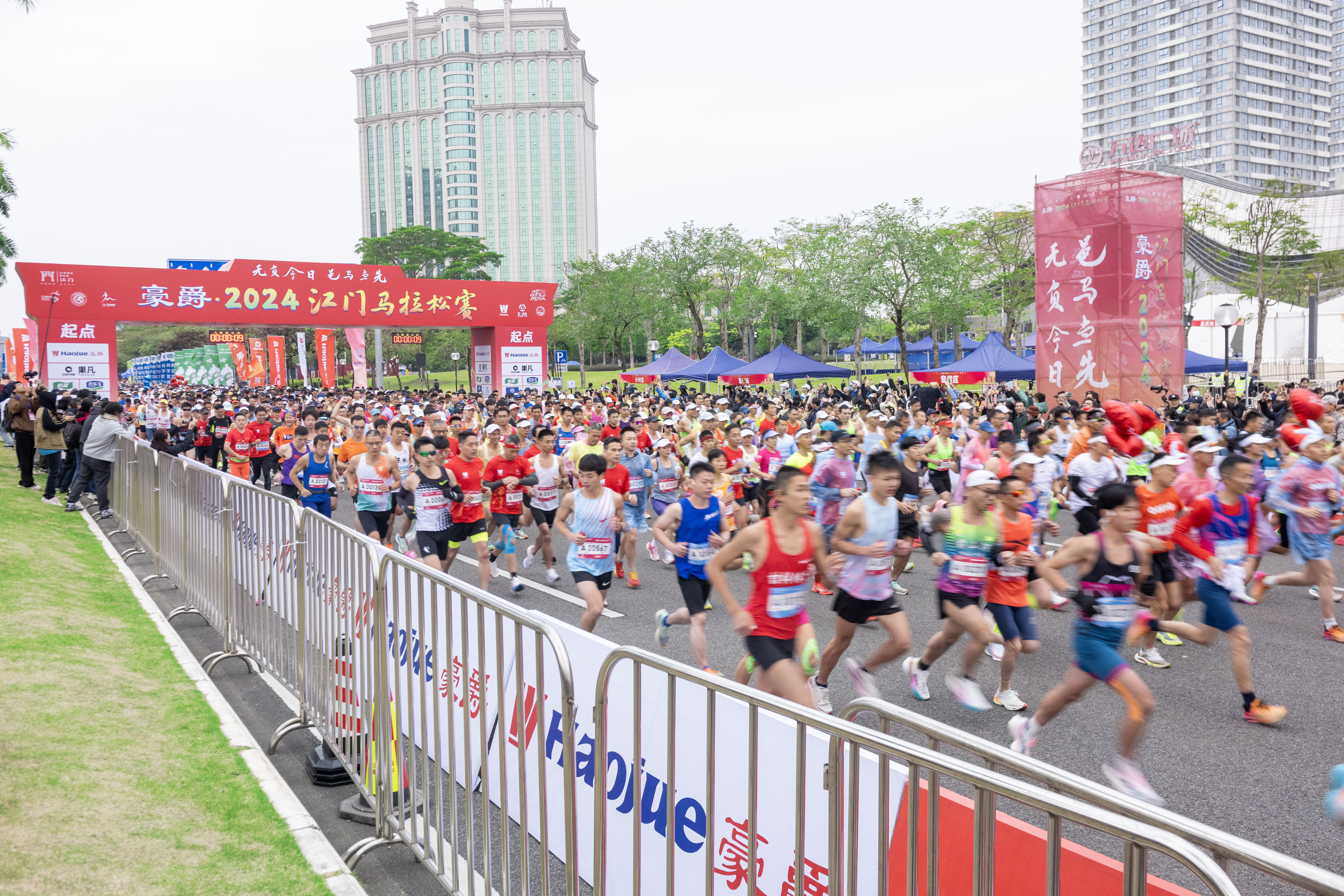 ??? 江門日報訊 (記者/陳敏銳) 跑一場馬,愛一座城!12月15日7時30分,隨著發(fā)令槍響,豪爵·2024江門馬拉松賽正式拉開帷幕。近2萬名跑者沿著風(fēng)景如畫的賽道盡情奔跑,用腳步丈量著中國僑都的古韻與繁華,向著終點全力沖刺,展現(xiàn)無限活力。市長吳曉暉,市領(lǐng)導(dǎo)陳冀、吳國杰、林健生、夏天、湯惠紅,廣東省田徑項目管理中心主任吳舜珊,江門市大長江集團(tuán)有限公司黨委副書記仵巖等出席起跑儀式,為大賽鳴槍發(fā)令。