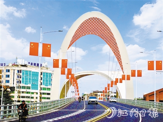 ????記者昨日走上新開通的江門船廠跨江橋發(fā)現(xiàn),橋梁兩邊懸掛著一面面五星紅旗(見上圖),展現(xiàn)蓬江“新年新氣象”;而在長堤歷史文化街區(qū),一排排亮眼、喜慶的紅燈籠高掛,寓意著新的一年將會(huì)紅紅火火、幸福美滿。