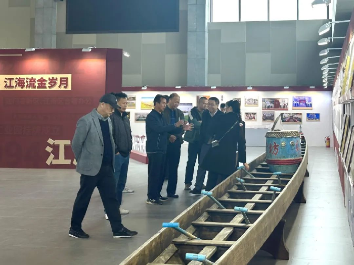 一張排粉海報(bào)映入眼簾,“‘燕子’牌排粉,是我們外海的一張美食名片,它不僅承載著江海人對(duì)美食的熱愛與追求,更反映了我們地區(qū)經(jīng)濟(jì)的蓬勃發(fā)展。”直沖村郭書記向大家講述其背后承載的江海文化與經(jīng)濟(jì)變遷。緊接著,他們的目光被展廳中一艘龍舟吸引,威東村李書記介紹道:“看,這就是我們江海區(qū)的龍舟文化象征。說(shuō)起‘江?!@個(gè)名字的由來(lái),還有一段佳話……”他簡(jiǎn)短而生動(dòng)地講述了“江?!泵峙c龍舟賽的淵源,引得眾人紛紛點(diǎn)頭贊同。退役軍人代表們聽著這些故事,對(duì)江海區(qū)30年來(lái)的滄桑巨變和發(fā)展成就有了更深刻的感悟。這些變化不僅讓他們對(duì)家鄉(xiāng)的未來(lái)充滿信心,也鼓舞他們?cè)谛碌恼鞒讨心木哿?、奮勇再出發(fā)。