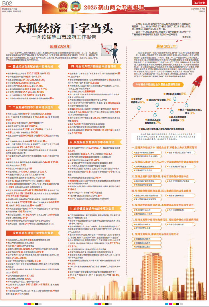 ????3月5-6日,鶴山市第十六屆人民代表大會第五次會議勝利召開。會上,鶴山市政府工作報告回顧了2024年鶴山市政府工作情況,部署2025年工作任務(wù)。