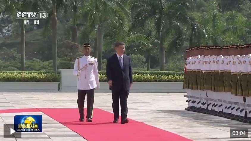 ??習(xí)近平乘車抵達(dá)時,易卜拉欣和馬來西亞總理安瓦爾在下車處熱情迎接。兩國元首登上檢閱臺,軍樂團(tuán)奏中馬兩國國歌,鳴禮炮21響。習(xí)近平檢閱儀仗隊。兩國元首進(jìn)入國家王宮大廳,同雙方陪同人員握手致意。