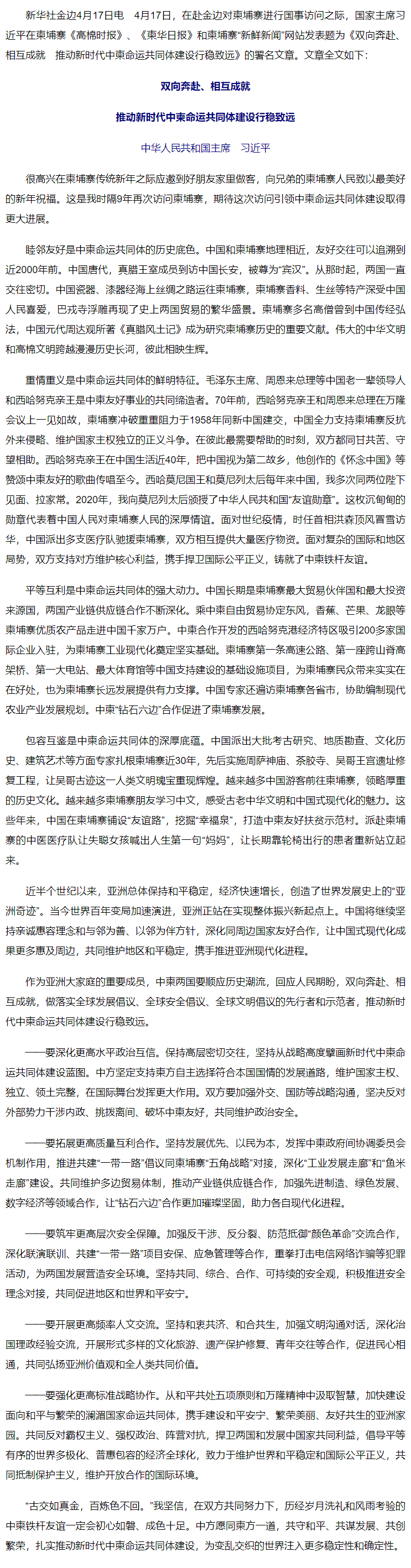 習近平在柬埔寨媒體發(fā)表署名文章