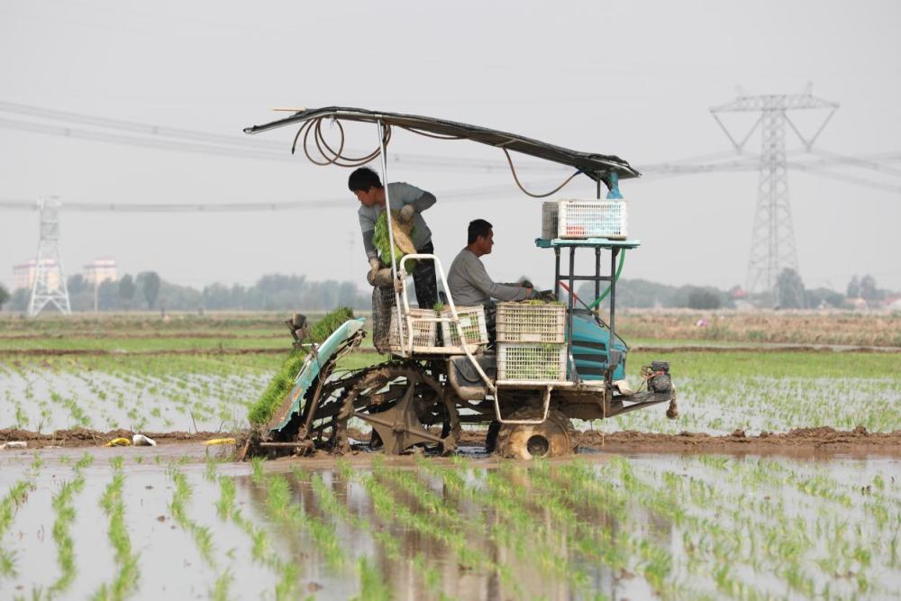 ??△2025年5月,農(nóng)民在河北滄縣南堤村的鹽堿稻田進(jìn)行插秧作業(yè)。