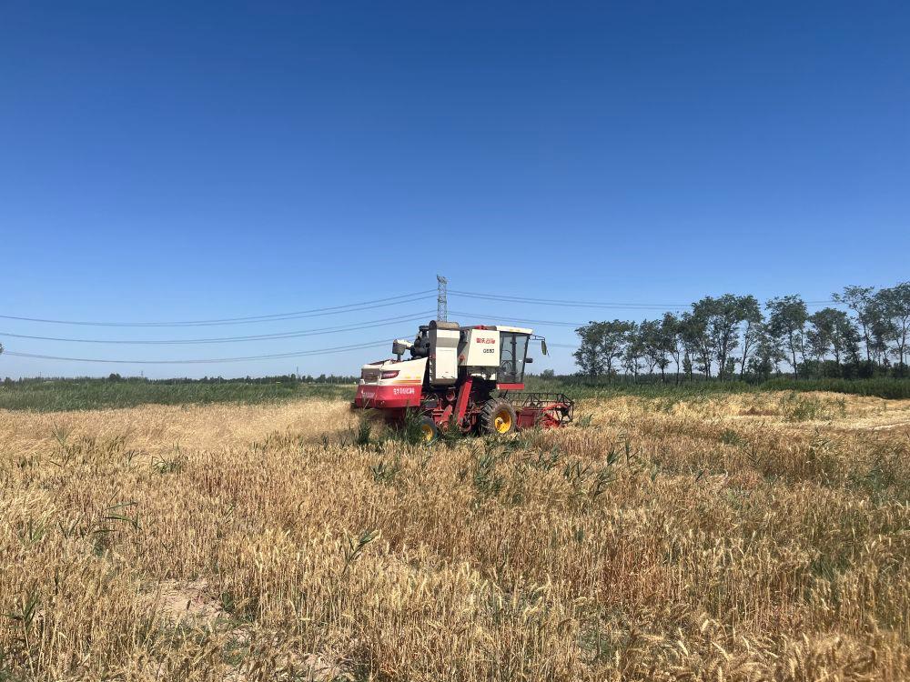 ??△收割機(jī)在山東武城縣郝王莊鎮(zhèn)的耐鹽堿小麥試驗(yàn)示范基地里作業(yè)。