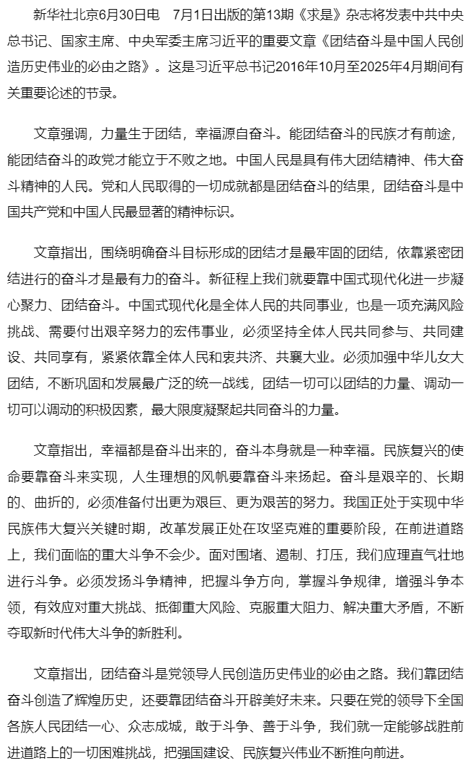 《求是》雜志發(fā)表習(xí)近平總書記重要文章《團(tuán)結(jié)奮斗是中國人民創(chuàng)造歷史偉業(yè)的必由之路》