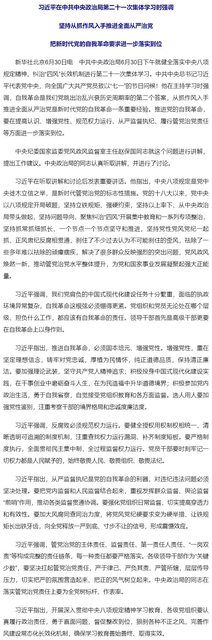 習(xí)近平:堅(jiān)持從抓作風(fēng)入手推進(jìn)全面從嚴(yán)治黨 把新時(shí)代黨的自我革命要求進(jìn)一步落實(shí)到位