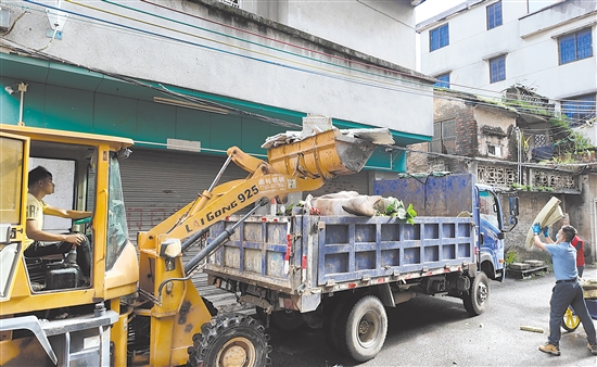 作為典型的城中村,里村社區(qū)因“三舊改造”及歷史遺留問題,留存100多間閑置房屋,不少冷巷深處堆積著垃圾雜物,衛(wèi)生黑點較多,是蓬江區(qū)人居環(huán)境整治的重點區(qū)域。“我們劃了6個片區(qū),分6組‘包干’推進,既要清垃圾、拆舊屋,還要徹底清理衛(wèi)生死角?!编u嘉琨說,在市、區(qū)、街道等各級機關(guān)企事業(yè)單位以及建筑企業(yè)、施工單位支持下,當(dāng)天集結(jié)的600人合力攻堅,清理廢棄綠植、閑置房屋積水雜物及建筑垃圾,全力保障群眾健康安全。