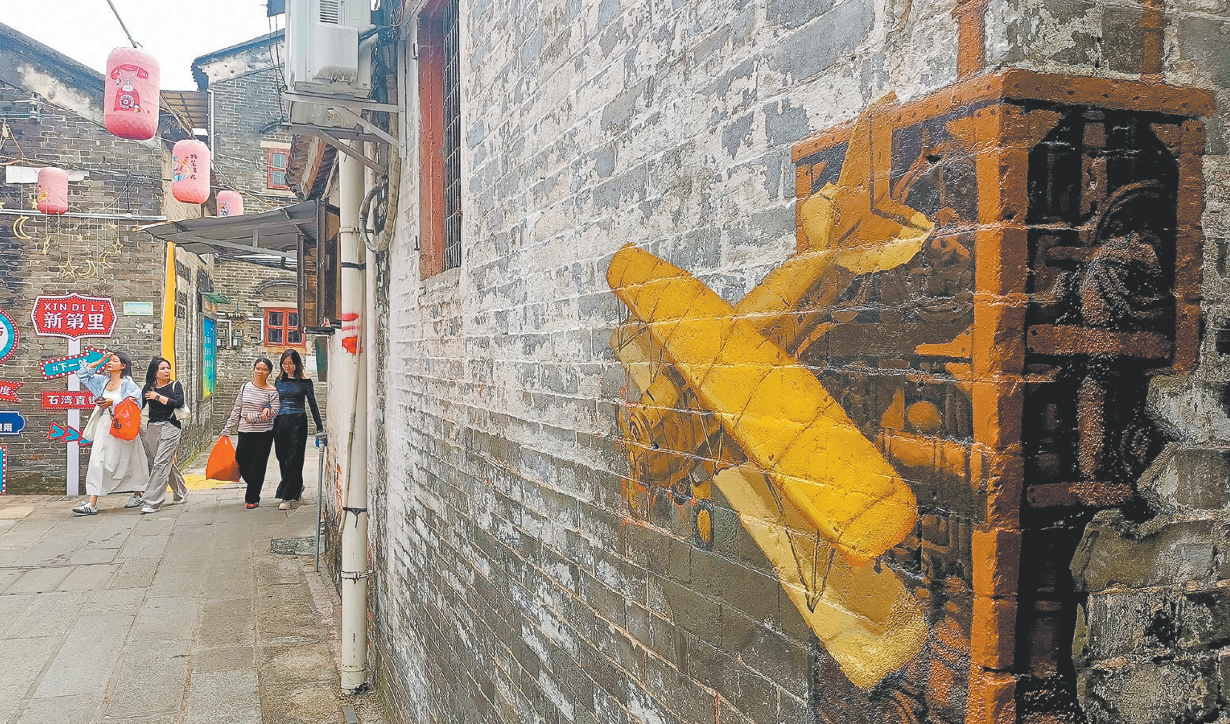 ????記者在啟明樓旁的一面青磚白墻上,看到了陳海豪繪制的題為“僑村風華煥新時光”的大型畫作。畫面中,啟明里的標志性僑屋——啟明樓與現(xiàn)代化的高樓建筑相互輝映、交融共生,點綴其間東藝宮燈,隱喻著歷史與未來的對話與傳承。另一幅作品《飛機》,則讓中國航空之父馮如設計的飛機從舊墻中呼嘯而出,致敬蓬江工業(yè)的創(chuàng)新與探索精神。