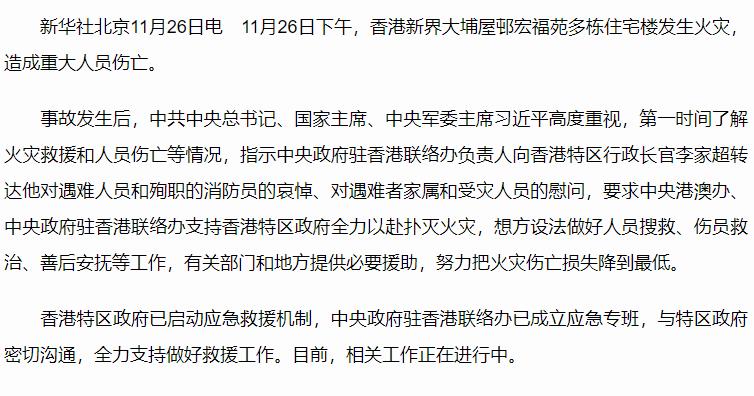習(xí)近平向香港新界大埔區(qū)住宅樓重大火災(zāi)事故遇難人員和殉職的消防員表示哀悼 對(duì)遇難者家屬和受災(zāi)人員表示慰問(wèn) 要求全力以赴撲滅火災(zāi) 努力把火災(zāi)傷亡損失降到最低