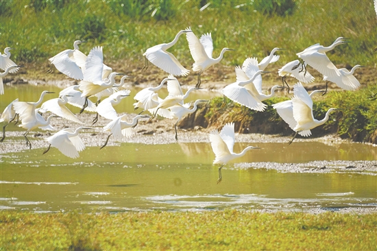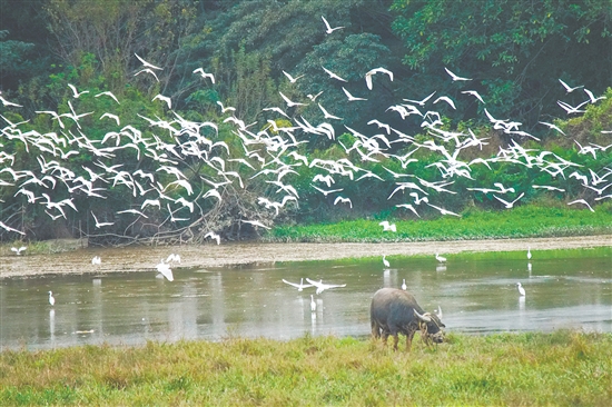 鷺鳥盤旋飛舞,展現(xiàn)出一幅“百鳥歸巢”的壯觀景象。