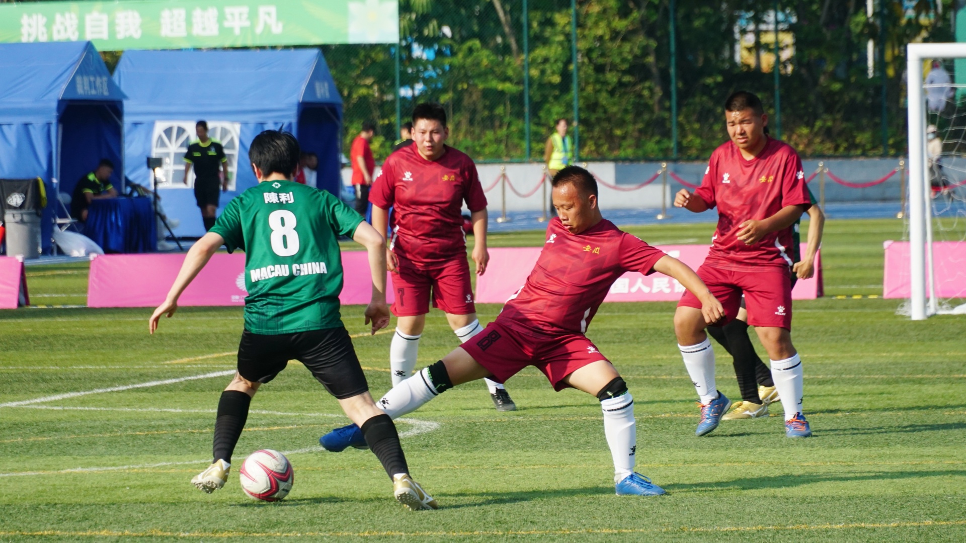 特奧足球運(yùn)動(dòng)員們奔跑、搶球,積極投入比賽。 郭永樂 攝