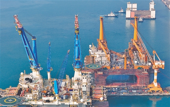 ????圖為12月16日,在中集來(lái)福士山東煙臺(tái)建造基地,多型海工裝備在進(jìn)行建造作業(yè)(無(wú)人機(jī)照片)。