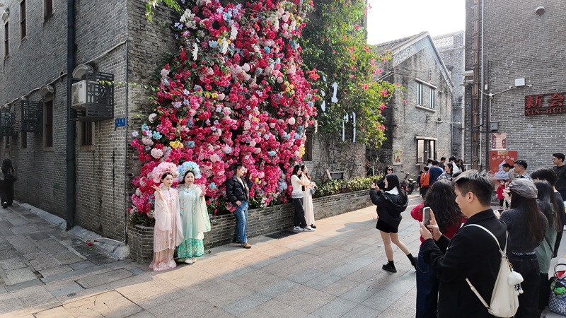 市民游客在長(zhǎng)堤歷史文化街區(qū)打卡拍照。任佳燕 攝