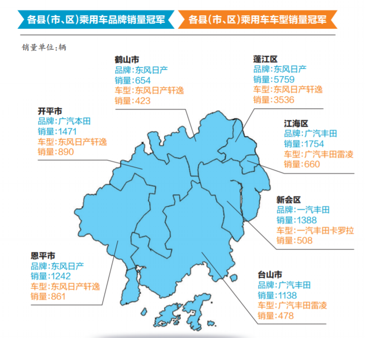 ????除了汽車品牌外,各縣(市、區(qū))消費(fèi)者對(duì)車型也是各有所愛。過去一年,江海區(qū)、臺(tái)山市兩地的消費(fèi)者對(duì)廣汽豐田旗下的雷凌青睞有加,東風(fēng)日產(chǎn)旗下的軒逸則最受蓬江區(qū)、鶴山市和恩平市消費(fèi)者的喜愛,其中軒逸在蓬江區(qū)的銷量高達(dá)3536輛,占據(jù)該車型全市總銷量的58%,新會(huì)區(qū)消費(fèi)者則最為鐘情一汽豐田旗下的卡羅拉。